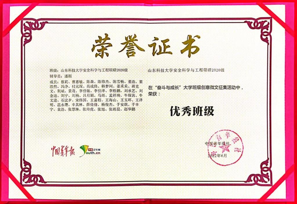 学术科研上,“学霸课堂,经验共享”。团支部制定学术论文研讨学习计划,由已发表高水平学术论文的同学、取得重大科创奖项的同学、授权发明专利的同学定期开展经验分享会,答疑解惑,带动班级更多同学取得新的更大成绩。截至目前,牛文进、刘承艺、韩梦珂、王海山、牛琛茜,成功硕博连读;景茂、刘杨获得2022年研究生国家奖学金;班级同学在Journal of Hazardous Materials、Journal of Cleaner Production、Energy、Fuel、煤炭学报等高水平期刊共计发表论文50余篇,其中1区SCI论文12篇,总影响因子达200+;团支部累计申请、授权发明专利20余项;张旭、李佳泽等获中国职业安全健康协会科学技术奖一等奖、中国煤炭工业科学技术二等奖;牛文进、宋伟国,获第十七届“挑战杯”全国大学生课外学术科技作品竞赛一等奖,累计获山东省十七届“挑战杯”大学生课外学术科技作品竞赛黑科技专项赛一等奖、第六届山东省“互联网+”大学生创新创业大赛金奖等50余项国家级、省部级奖项。