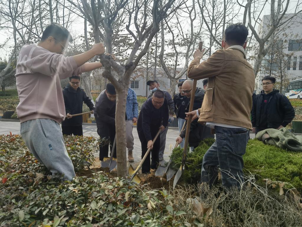 随后,在后勤处绿化科刁老师对于紫薇树生长环境要求、植树方法以及植树流程的悉心讲解下,同学们拿起铁锹倾情投入到植树活动中,几人一组相互配合,挥锹铲土、扶苗培土、围堰浇水,顺利种下饱含感恩之情的紫薇树。温暖春风里,新栽植的小树在道路上笔直挺立,萌发出盎然生机,大家以最诚的心表达自己最真的情。活动最后,学院领导以及班级全体成员在横幅上签下自己的名字,并与紫薇树合影留念。