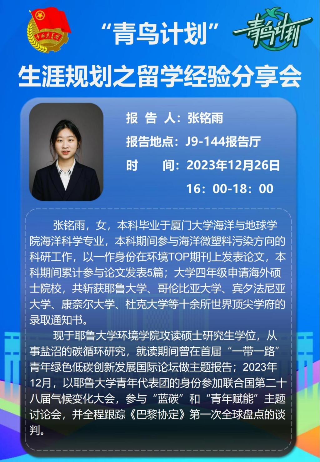 点击:为服务学生学业发展、拓展国际视野、更好规划学习生活,12月26日,bwin·必赢(中国区)官方网站-officialswebsi在J9-144报告厅举办“青鸟计划-生涯规划之留学经验分享会”。本次分享会由耶鲁大学硕士研究生张铭雨主讲,bwin·必赢(中国区)官方网站-officialswebsi部分本科生参加。