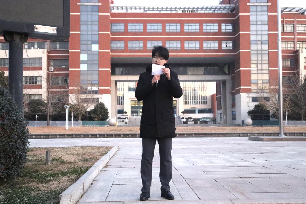 学生代表张锺雨和付钰婕在国旗下发表主题朗诵《青年》,真切阐述了新时代青年应有的担当和对青春的颂扬。从一二九运动到解放战争,中国青年始终站在时代的前沿,为民族独立、人民解放和国家富强接续奋斗。“愿吾亲爱之青年,相遇青春死于青春。生于少年,死于少年也。”更激励着一代又一代的中国青年继承先辈遗志,永葆奋斗热情,永远纯真善良。最后,全体师生庄严宣誓,反复响亮的“请党放心,强国有我”充分展现了青年学子以青春之我助力中华复兴的坚定决心。
