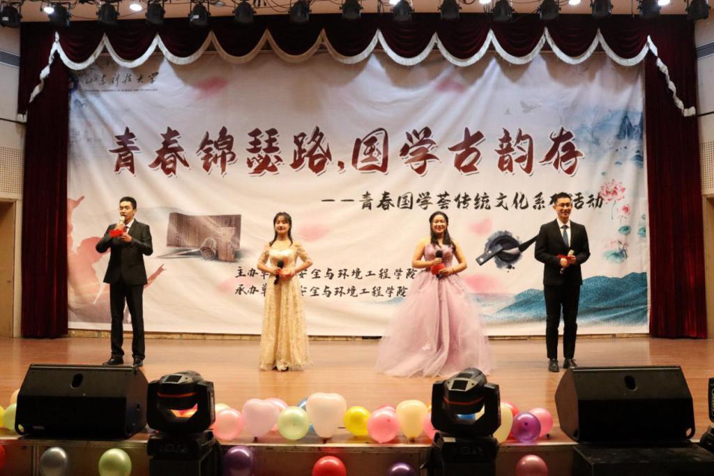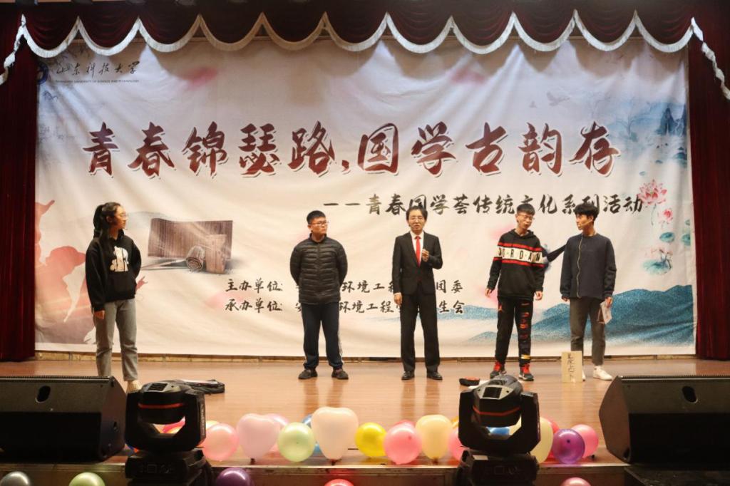 为丰富校园文化生活,提高学生形象素质11月30日,由安全与环境工程学院团委安全与环境工程学院学生会承办的“青春锦瑟路,国学古韵存”传统文化系列活动在大学生活动中心二楼报告厅举办。学院党委副书记兼副院长王建友,团委书记潘刚,团委老师郭熙、李玉洁、满天雷姜振丽,院学生会执行主席张振兴担任评委。