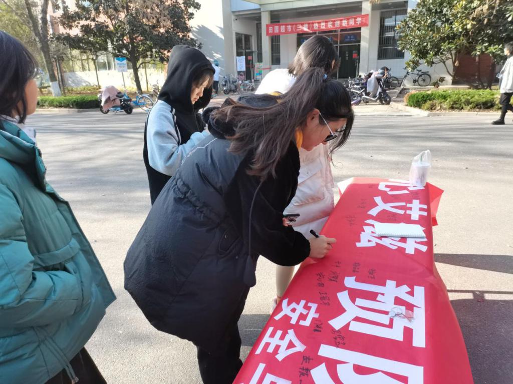 活动采取线上答题、线下签名相结合的方式,通过完成网络平台上的相关问题来夯实学生艾滋病预防工作基础增强广大青年学生的防病意识和自我保护能力。同时为进一步深化此次线上教育活动,学院青年志愿者协会为参加活动的同学准备了关心艾滋,预防艾滋主题条幅,每位完成线上答题同学可在横幅上进行签名并留下寄语。随着时间点点流逝,横幅上的名字愈加增多,预防艾滋病的相关知识铭记于同学们心间,横幅前也留下了同学们坚毅的身影。