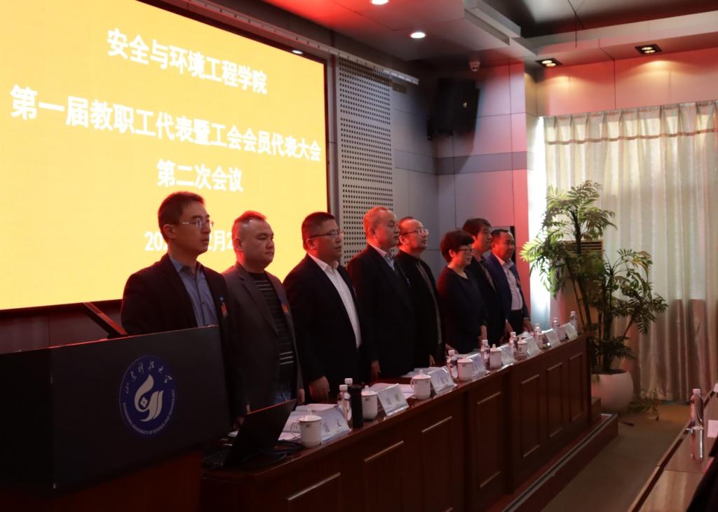 在雄壮的国歌声中,安全与环境工程学院第一届教职工代表大会暨工会会员大会第二次会议胜利闭幕。(郭熙 时林超)