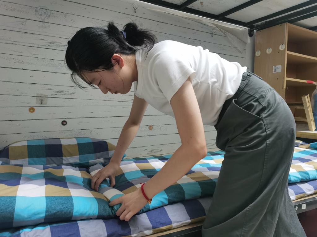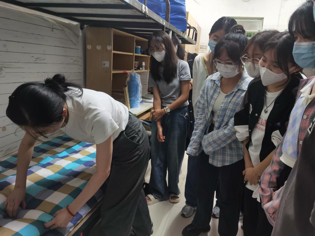 “被子三分叠七分整,要牢记‘平、折、压、抠、卡、齐、直、正’这个叠被要领。"新生宿舍里,2020级退役学生陈现超细致耐心地向新生们讲授叠好被子的诀窍和方法。被角一抖,用手抹平,经过他的“加工制作”,一床“豆腐块”般的被子诞生了,新生们纷纷被这娴熟的动作圈粉。被子一捋,四四方方;书籍归类,整整齐齐;鞋子衣物,各有归处....在长达一个多小时的“高水准”内务规范“现场实操”中,陈现超和孙雅晴一针见血地指出新生宿舍中内务整理的不规范之处,示范整理动作干净利落。从书的摆放到阳台杂物的放置,从洗漱用品的归类到柜中衣物整理,他们都给了新生们进行了高效的归纳指导,前几分钟还稍显杂乱的宿舍眨眼间就变得整齐宽敞,大家纷纷感慨这次的内务整理教学真是“硬核”!