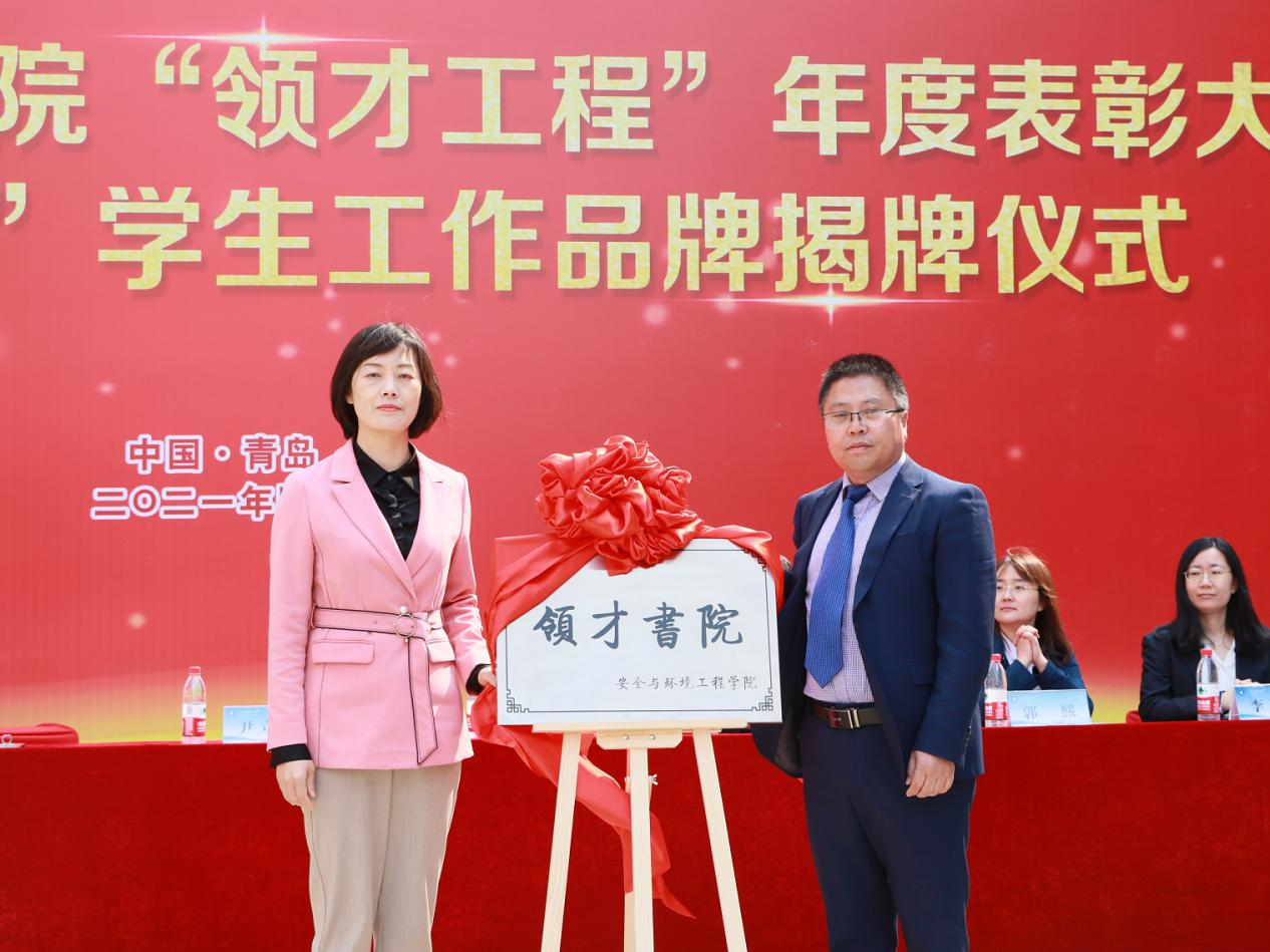校团委书记尹立明、学生工作处副处长孔环学院党委书记张恩生、党委副书记兼副院长王建友为“五色生花”学生工作品牌和“领才书院”一站式社区揭牌。