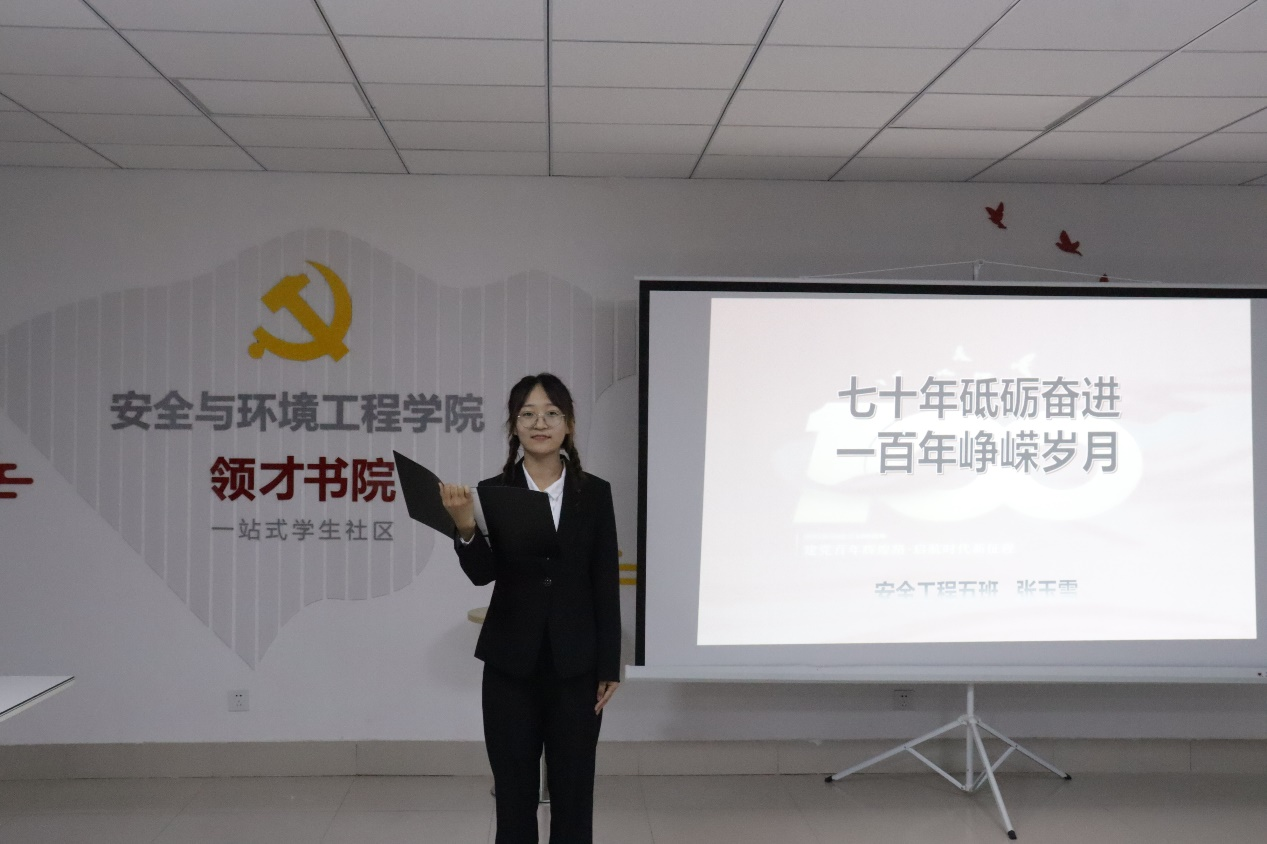 比赛现场,选手们围绕“建党百年”和“我眼中的科大”两大主题,借助精美的ppt,用真实鲜活的案例声情并茂地讲述了自己对祖国对科大的深厚情感,展现了安全学子敢于有梦、勇于追梦、勤于圆梦的热情,表达了安全学子热爱祖国、热爱校园、励志做新时代青年的豪情。在场评委为每一位选手进行细心点评,亲切指导,并为选手打分。最终,三位参赛选手脱颖而出,环境四班孙悦、环境一班刘洋、安全五班张玉雪分别获得比赛一二三名,并由孙坤、徐兴建、赵阳为其颁发获奖证书。