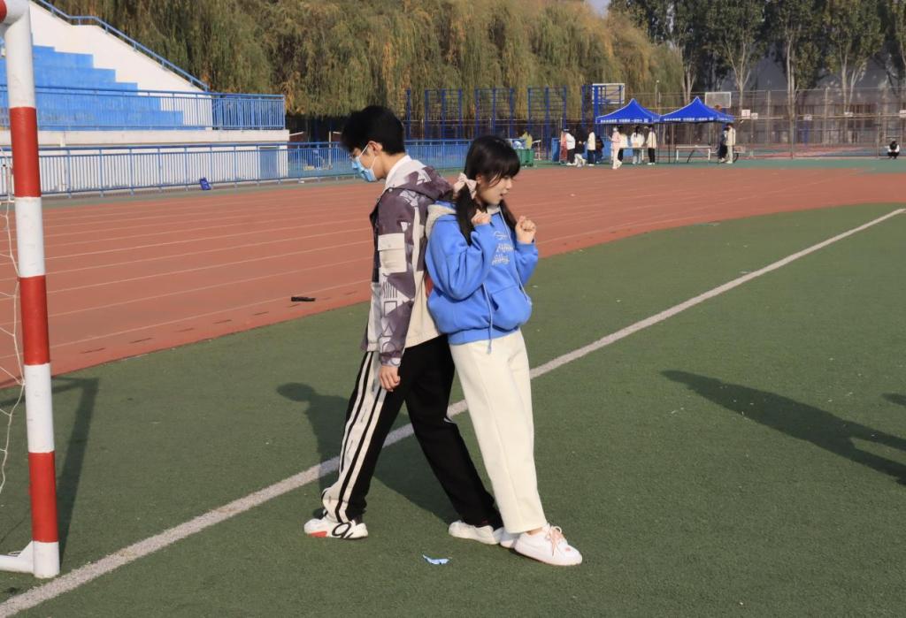 迎着秋日的朝阳,活动正式开始。“吟诵映初心--‘爱’说给你听”拉开序幕,同学们六人一队排成一条线,依次用方言传递诗句,由最后一名同学用普通话说出听到的句子。各具特色的方言一出,欢笑声顿时响彻操场,现场成了一片欢乐的海洋。“心有灵犀--共发展向未来”推动活动进入高潮,同学们两人一队,五队进行现场“你比我猜”比拼,首先猜出指定词语的队伍获胜。负责比划的同学在接收到指定词语后使用肢体语言将信息传达给同伴,丰富的表情和滑稽的动作引来围观同学的一阵阵欢声笑语。趣味横生的“其利断金——共克时艰万难”环节,又为本场活动增添更多色彩。此环节以“两人三足”形式进行,参赛小组需将盛满水的水杯运送至赛道尽头,签名标记后再原路返回,最快到达终点且杯中水最多的一组获胜。游戏中,有配合默契,健步如飞的小组;也有因为口号不一,步调凌乱而被绊倒的小组。但无论多么艰难,每一组都没有放弃,完成了比赛。整场活动中,参与游戏的同学个个全力投入,力争第一,展现了极大的个人风采和团队精神,彰显了同学们之间的凝聚力,现场气氛热烈而又紧张,扣人心弦而又不失活泼。