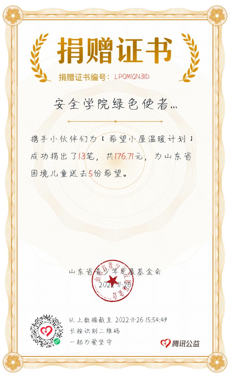 在院团委的高度重视和大力支持下,bwin·必赢(中国区)官方网站-officialswebsi绿色使者依托腾讯公益平台开展“520公益日”活动进行小额网络募捐,来帮助山东省部分困境儿童筹集希望,打造“梦想小屋”,让他们感受到社会的关爱。5月20日院团委积极发动教职员工、共产党员、共青团员等青年积极参与、奉献爱心。与此同时bwin·必赢(中国区)官方网站-officialswebsi绿色使者协会联合青年志愿者协会,面向青年学生,特别是青年学生骨干,加大“520公益日”的宣传力度,用“希望小屋”故事感染同学、号召同学们献出属于自己的一份关爱,为建设“希望小屋”出一份力。同学们纷纷转发,扩大宣传“朋友圈”。截至5月25日,bwin·必赢(中国区)官方网站-officialswebsi“希望小屋”为山东省困境儿童筹集希望“520公益日”活动共募集善款176.71元。该项活动所得善款将全部汇入山东省青少年发展基金会账户,最终用于山东省“希望小屋”建设,每一笔义卖款的去向均可追溯。