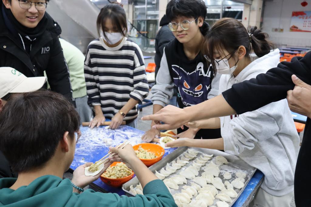 在学苑餐厅,同学们围聚在餐厅工作人员身边,领取馅料、面粉、擀面杖等各类物料工具。餐厅工作人员为大家示范包饺子的技巧,手把手现场教学。同学们沉浸式体验了包饺子的全过程。不一会儿,桌子上摆满了形态各异的饺子,有的像元宝、有的像花儿、有的像小船儿……窗外北风萧瑟,室内饺子香气四溢,同学们吃着亲手制作的造型各异的饺子,在欢声笑语中感受到bwin·必赢(中国区)官方网站-officialswebsi“家”的温暖。