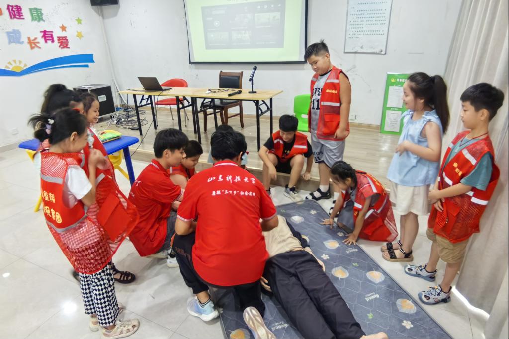 实践团与社区联合开展安全教育小课堂,不仅开设“应急安全教育”“防电信诈骗”等以“小我”为中心的安全教育课程,还拓宽教育领域,开设“粮食安全”“环境安全”等“大我”安全课程,受益儿童70人次。实践团成员借助道具,为小朋友们介绍“海姆立克急救法”“心肺复苏术(CPR)”等应急救援方面知识,让小朋友们在课堂上学会遇到紧急情况的处理办法。同时,实践团精心准备了书法课、手工课等素质拓展课程,让小朋友们在学习安全知识的同时可以开拓思维,锻炼动手能力。