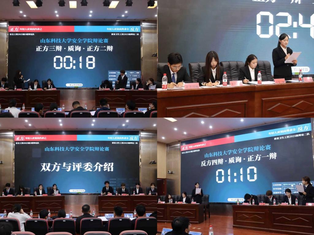 决赛由职业卫生工程2025班一队、二队、安全工程2025-3班、安全工程2025-5班四支队伍两两对决,依据现场综合得分角逐最终荣誉。两场对决分别围绕“青春终将逝去VS青春永不逝去”和“当代年轻人更应该向内求己VS当代年轻人更应该向外求全”展开辩论。比赛过程中,辩手们围绕议题展开激烈交锋,立意高远,思考深邃;整场比赛,既有立论陈词的严谨架构,亦有短兵相接的机敏驳斥,攻守转换之间,尽显其缜密的逻辑思维与高度的团队协作;自由辩论环节更是唇枪舌剑,语言如刀光剑影,金句层出不穷。经过激烈角逐,职业卫生工程2025班一队夺得冠军,安全工程2025-5班、安全工程2025-3班分获亚军、季军,来自职业卫生工程2025班一队的毕如茜荣获“最佳辩手”称号。