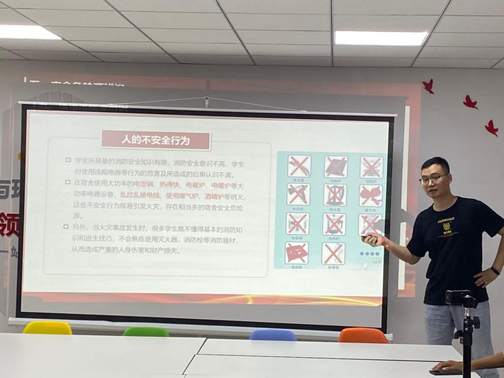 随后,贺敏讲解了遭遇暴雨、洪涝灾害时的应对策略,并从“人的不安全行为”和“物的不安全状态”分析了宿舍存在的消防安全隐患;同时细致地剖析了危化品给宿舍安全带来的严重威胁,并结合踩踏事故的案例给同学们科普了在应急疏散过程中如何避免踩踏的相关知识。