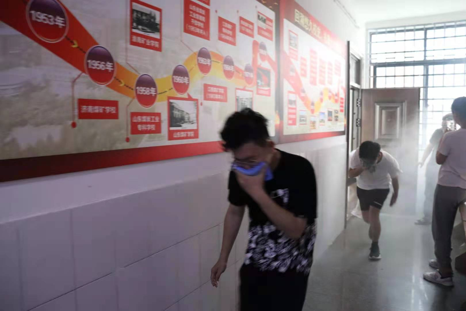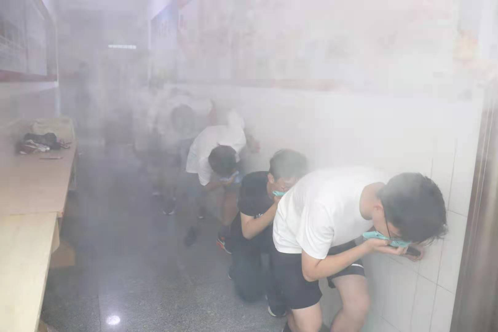 为了让大家切身感受到相对真实的火灾现场情形,现场通过制造烟雾的形式模拟真实场景,并指导学生火场逃生、蒙鼻匍匐的正确方法。
