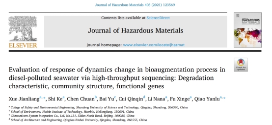 点击:近日,我院薛建良副教授课题组在环境领域TOP期刊《Journal of Hazardous Materials》(IF=9.038)上发表了题为“Evaluation of response of dynamics change in bioaugmentation process in diesel-polluted seawater via high-throughput sequencing: Degradation characteristic, community structure, functional genes”的论文。文章采用生物强化技术对模拟的海洋溢油事件进行修复,并对原生海洋环境,溢油过程以及生物强化修复过程的微生物群落结构进行了研究。