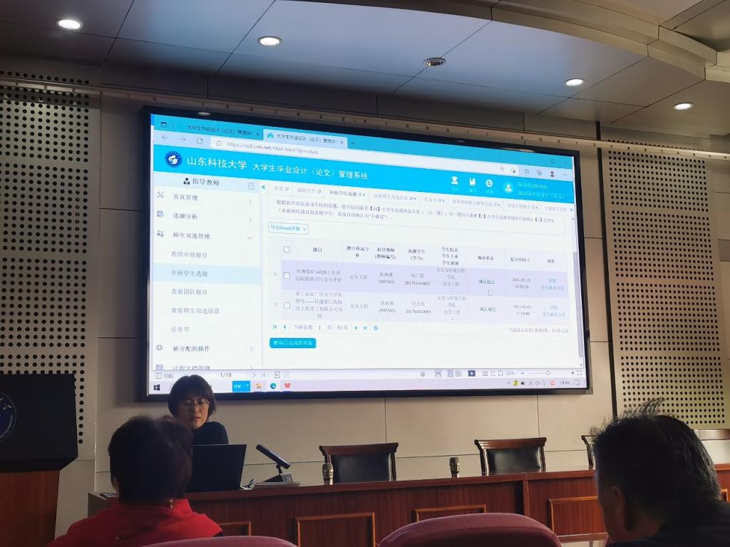 陈海燕老师首先带领老师们学习了去年下发的《关于做好 2021届本科毕业生毕业设计(论文)相关工作的通知》和《bwin·必赢(中国区)官方网站-officialswebsi本科生毕业设计(论文)工作管理规定》,梳理了毕业设计(论文)需要提交的所有材料,对文件要点进行了解读。随后陈老师在毕业设计(论文)管理系统中针对每一个功能进行了详细的讲解,就登陆方法、上传过程材料、时间节点等方面提供了许多建议。安全工程系杨文宇老师也提到指导教师一定要注意答辩成绩提交的时间节点。