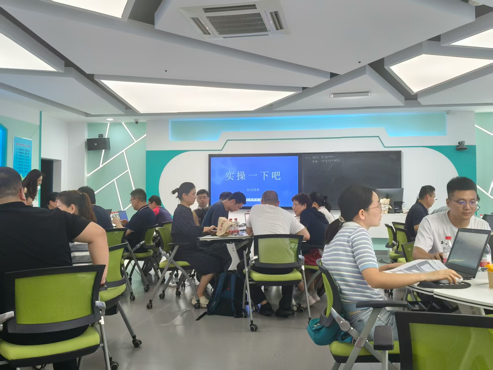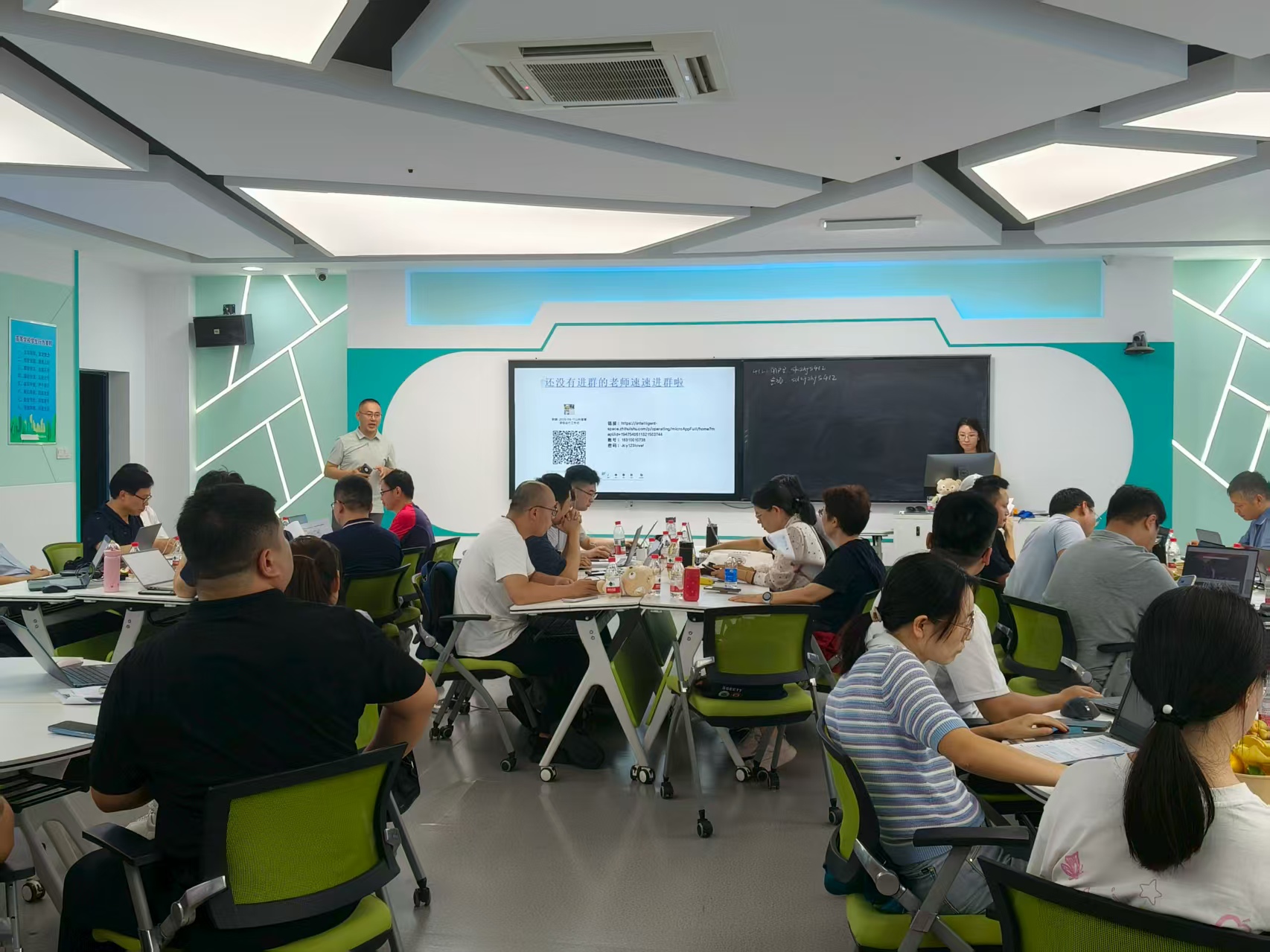 随后进入实操学习环节,智慧树的孙媛媛老师以 “任务驱动” 为导向,设计了妙趣横生的分组实践任务。在孙老师的细致指导下,老师们以小组为单位,亲身参与智慧课程建设全流程,逐步熟悉建课步骤、模块设置等基础操作,并深度体验 AI 个性化应用功能,如智能题库匹配、个性化学习路径推荐等。为激发参与积极性,工作坊还设置了激励机制,课后为实操表现优秀的老师颁发了定制小礼物,现场学习氛围浓厚且活跃。