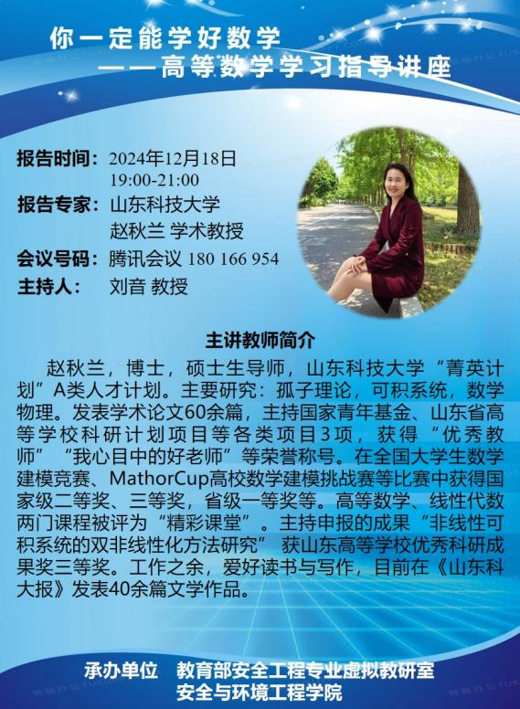 2024-12-31临近期末考试,为提升2024级新生高等数学学习技巧,顺利通过高等数学期末考试,2024年12月18日,bwin·必赢(中国区)官方网站-officialswebsi协同教育部安全工程虚拟教研室举办高数学习线上讲座。讲座由赵秋兰教授主讲,刘音副院长主持,旨在激发学生对高等数学的学习兴趣,提升学习能力,帮助学生在高等数学学习上取得更好的成绩。赵秋兰教授凭借丰富的教学经验和学术成就,为学生提供了宝贵的学习策略。本次讲座从“三讲”原则、“三目标”、“两条线交叉”三个...