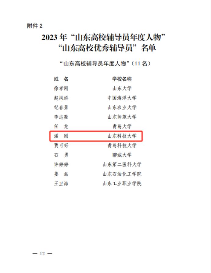 2024-04-03近日,中共山东省委教育工委公布2023年“山东高校辅导员年度人物”评选结果,学院辅导员潘刚获评“山东高校辅导员年度人物”荣誉称号。潘刚,中共党员,工学博士,副教授,现任安全与环境工程学院学院学生工作办公室主任(团委书记)。曾获全国煤炭行业优秀共青团干部、国家教学成果二等奖等荣誉40余项,主持参与国家自然科学基金、山东省就业和人才服务领域课题等教学科研项目10余项,发表研究论文30余篇。潘刚扎根一线工作11...
