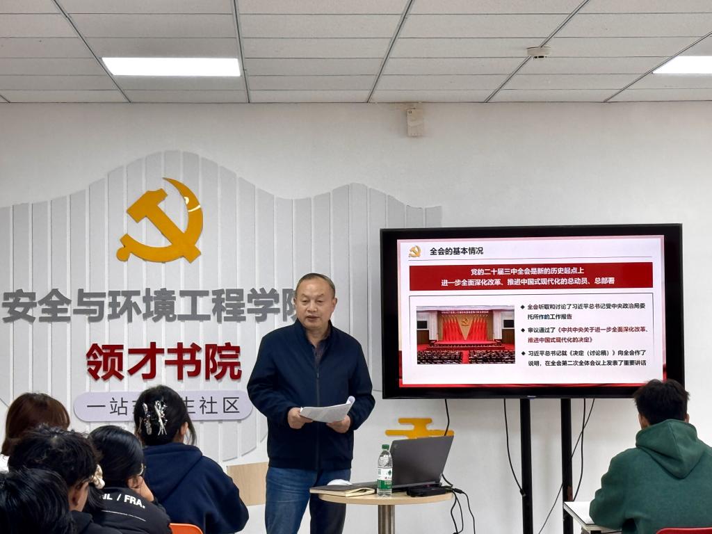 2024-11-08为深入学习贯彻党的二十届三中全会精神,切实增强同学们的政治责任感和历史使命感,11月7日,bwin·必赢(中国区)官方网站-officialswebsi党委书记张恩生于GC4“一站式”学生社区-“领才书院”为联系班级学生作党的二十届三中全会精神宣讲报告。张恩生以党的二十届三中全会以来取得的丰硕成果为切入点,全面回顾了会议基本情况、习近平总书记重要讲话精神、《中共中央关于进一步全面深化改革推进中国式现代化的决定》提出的重大举措,深入解析全会在理论创新、政...