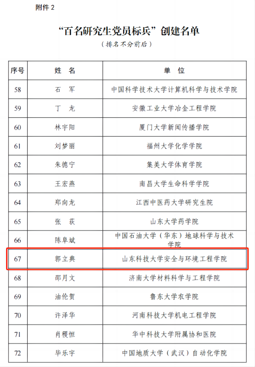 2024-05-14近日,教育部公布了第三批全国高校“百名研究生党员标兵”创建工作评审结果。我院博士研究生郭立典入选“百名研究生党员标兵”。郭立典,男,中共党员,安全科学与工程2021级在读博士。在校期间,牢记初心使命,怀揣报国之志,攻关卡脖子技术,在粉尘防治领域取得国际领先水平,发表高水平SCI论文7篇,申请发明专利4项;获全国煤炭行业优秀共青团员、研究生党员标兵等荣誉15项;获第十七届“挑战杯”大学生课外学术科技作品竞赛...